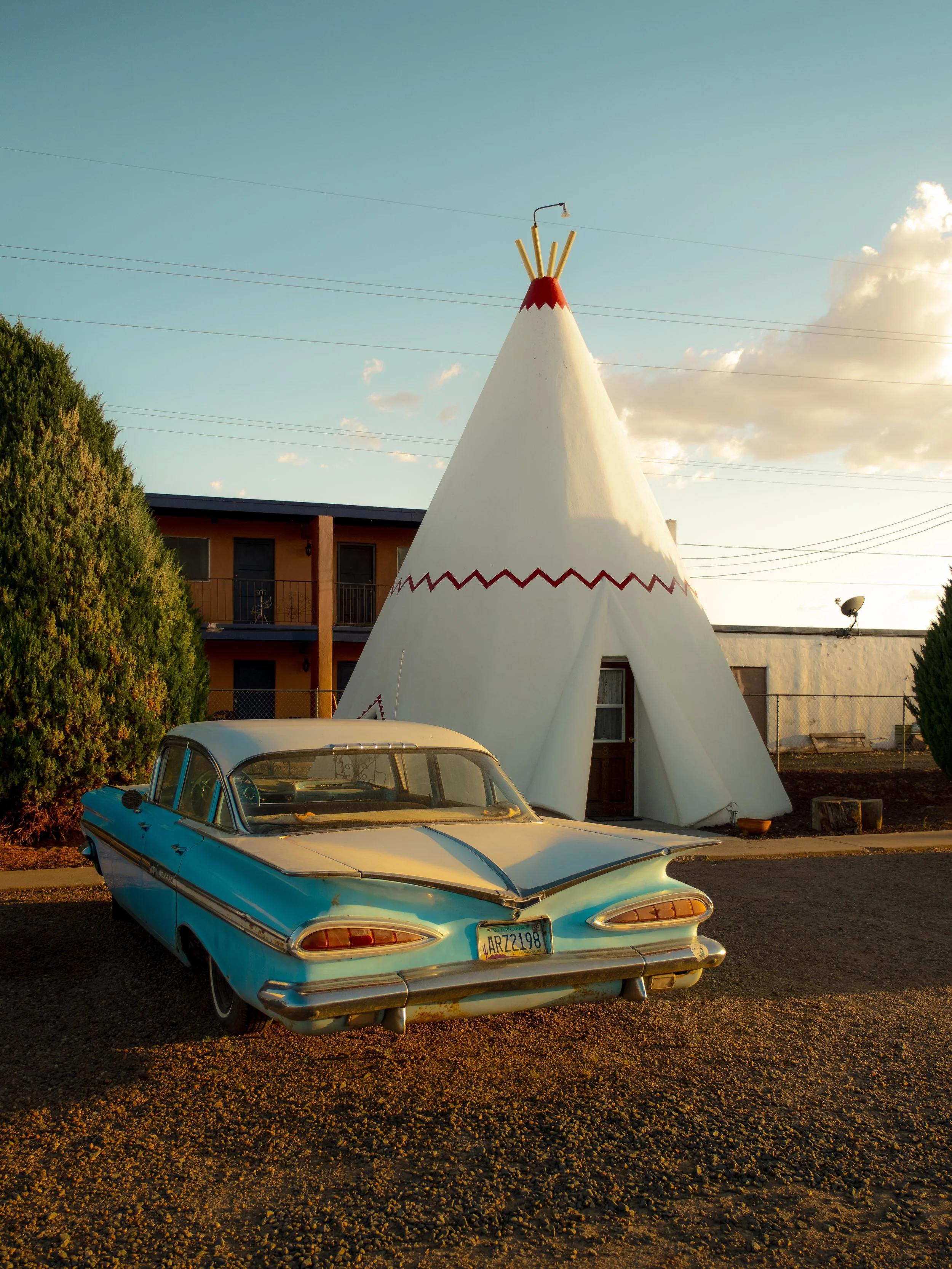 The series captures the vivid contrast of this synthetic architecture — the teepees, vintage cars, and utility poles — against the deep Arizona sky. Focusing on hard shadows and abstract shapes, it explores the manufactured landscape and the quiet, nostalgic drama of a legendary stop along the road.